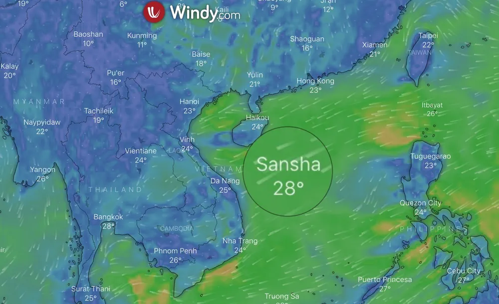 Ứng dụng Windy hiển thị quần đảo Hoàng Sa của Việt Nam là Tam Sa (Sansha). Ảnh: TIỂU MINH