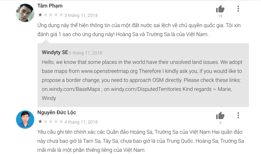 Tương tự, người dùng có tên Tâm Phạm đã đánh giá 1 sao cho ứng dụng Windy vì thể hiện chủ quyền lãnh thổ sai lệch...