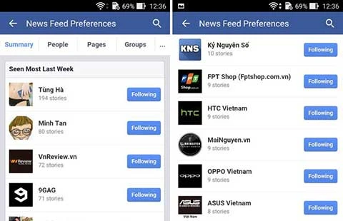 Tại đây sẽ bao gồm năm mục là Summary (những bạn bè và fanpage có nhiều bài đăng), People (danh sách bạn bè đăng bài nhiều nhất), tương tự như vậy cho mục Pages, Groups và Apps. Nếu muốn ưu tiên hiển thị nội dung của một người bạn hoặc một trang bất kỳ, người dùng chỉ cần chạm vào nút Follow (theo dõi) và ngược lại.