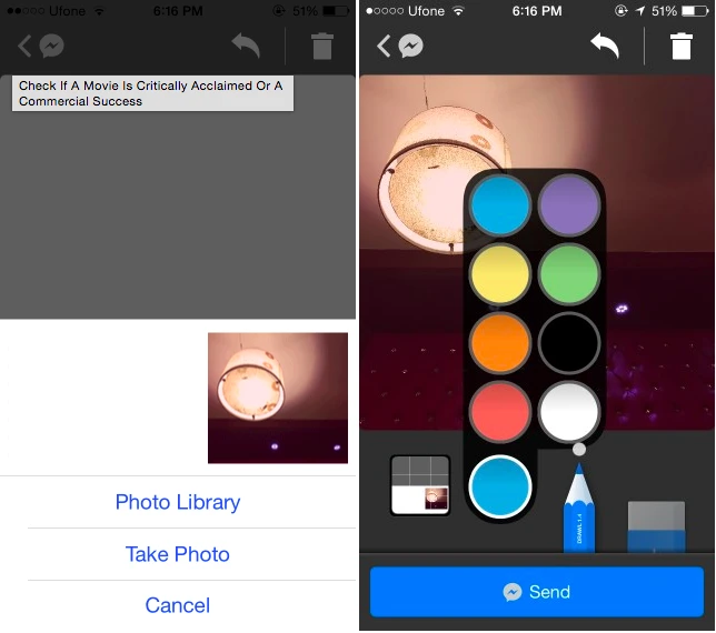 Nếu muốn loại bỏ những gì đã vẽ trước đó, bạn hãy chạm vào nút Undo ở trên cùng hoặc nhấn Send để gửi ảnh đi cho bạn bè hoặc nhóm bạn trên Messenger. Bên cạnh đó, người dùng cũng có thể thêm một vài dòng chú thích trước khi gửi ảnh đi.