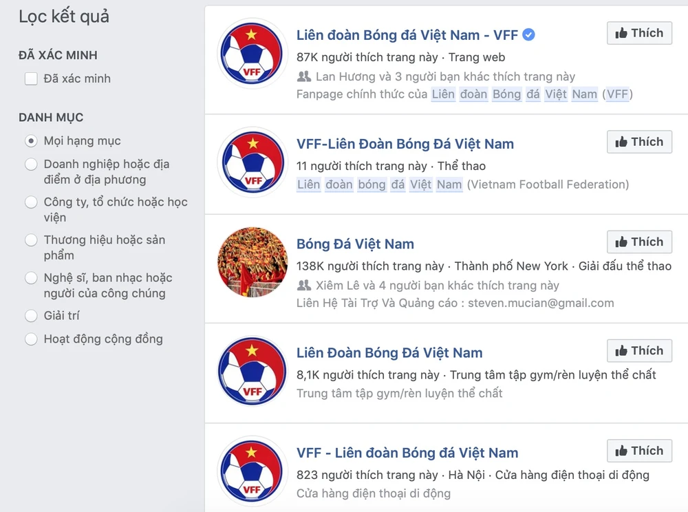 Khi thử tìm kiếm từ khóa Liên đoàn Bóng đá Việt Nam - VFF, bạn sẽ thấy xuất hiện hàng loạt fanpage giả mạo (không có dấu tick xanh). Mục đích của những trang này đa số đều để câu like, view và tăng lượng theo dõi, sau này sẽ đổi tên để bán cho những người có nhu cầu hoặc phục vụ cho việc lừa đảo.