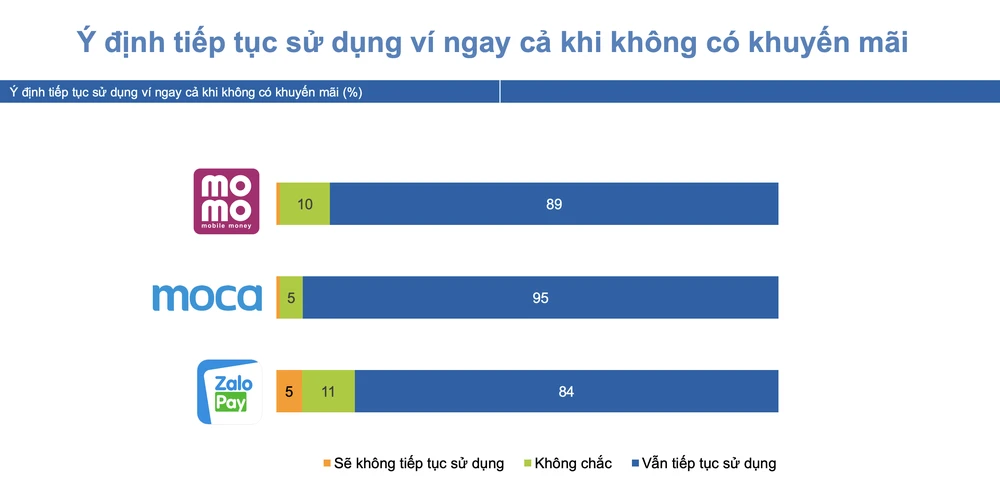 Mức độ hài lòng của người dùng đối với ba ví điện tử phổ biến cao gần ngang nhau. Trong đó, người dùng Moca dẫn đầu về mức độ gắn bó với ví ngay cả khi không có khuyến mãi.