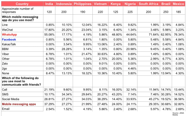 Theo dữ liệu khảo sát của Jana Mobile, WhatsApp được sử dụng phổ biến hơn Facebook Messenger ở một số quốc gia đang phát triển. Tại Ấn Độ, Brazil và Mexico, số người được phỏng vấn dùng WhatsApp nhiều hơn gấp 12 tới 64 lần so với người dùng Facebook Messenger. Facebook thực sự muốn chinh phục số lượng người dùng lớn ở những quốc gia đông dân này.