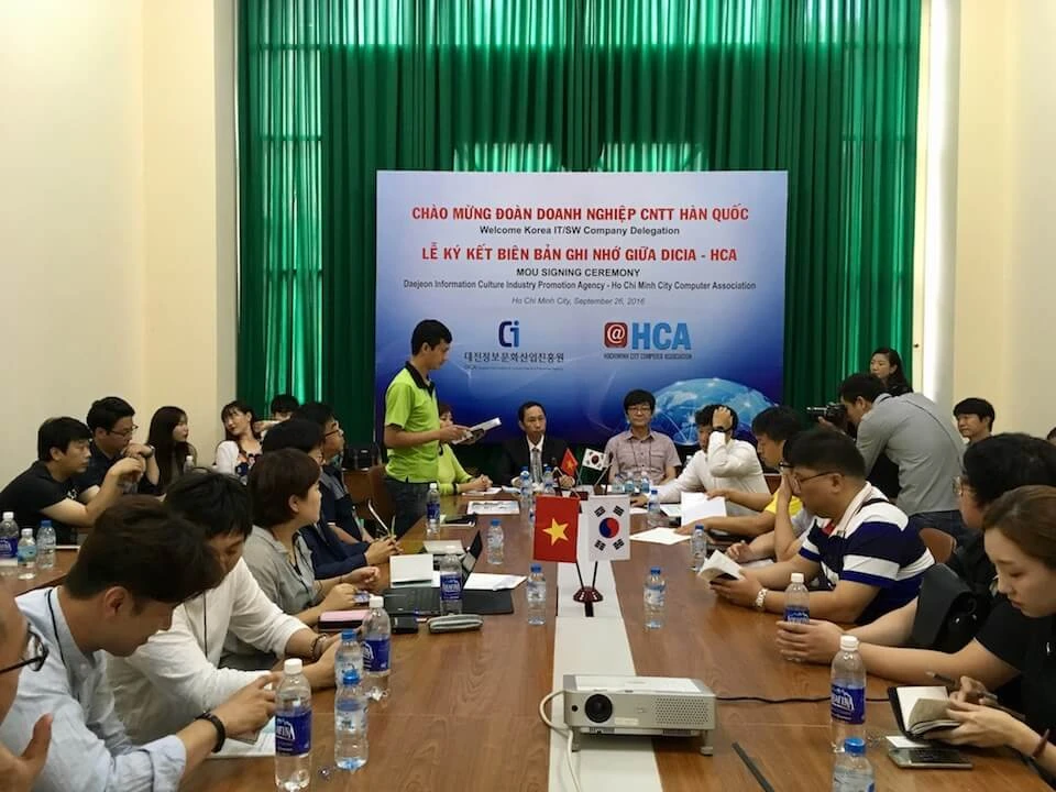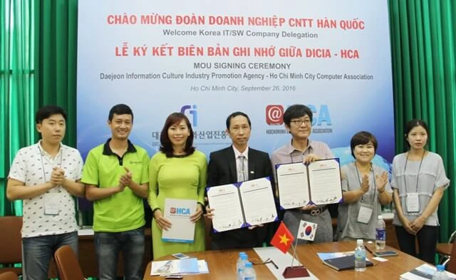 Trước đó, vào ngày 26-9, đoàn 13 doanh nghiệp CNTT Hàn Quốc với hơn 50 đại biểu đã có buổi thăm và kí kết biên bản ghi nhớ hợp tác giữa Hội Tin học TP.HCM (HCA) và Cục Xúc tiến ngành Văn hóa và Thông tin Deajeon (DICIA).