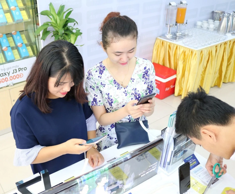 Khách hàng tham khảo điện thoại Sam Sung tại Viettel Store.