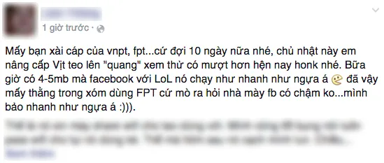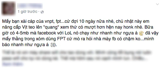 "Trong khi nhiều bạn bè than phiền về việc truy cập vào Gmail và Facebook không nổi khi đứt cáp, thì bản thân mình ở nhà xài cáp quang Viettel vẫn vào bình thường." -Anh Hải Nam, một lập trình viên chia sẻ.