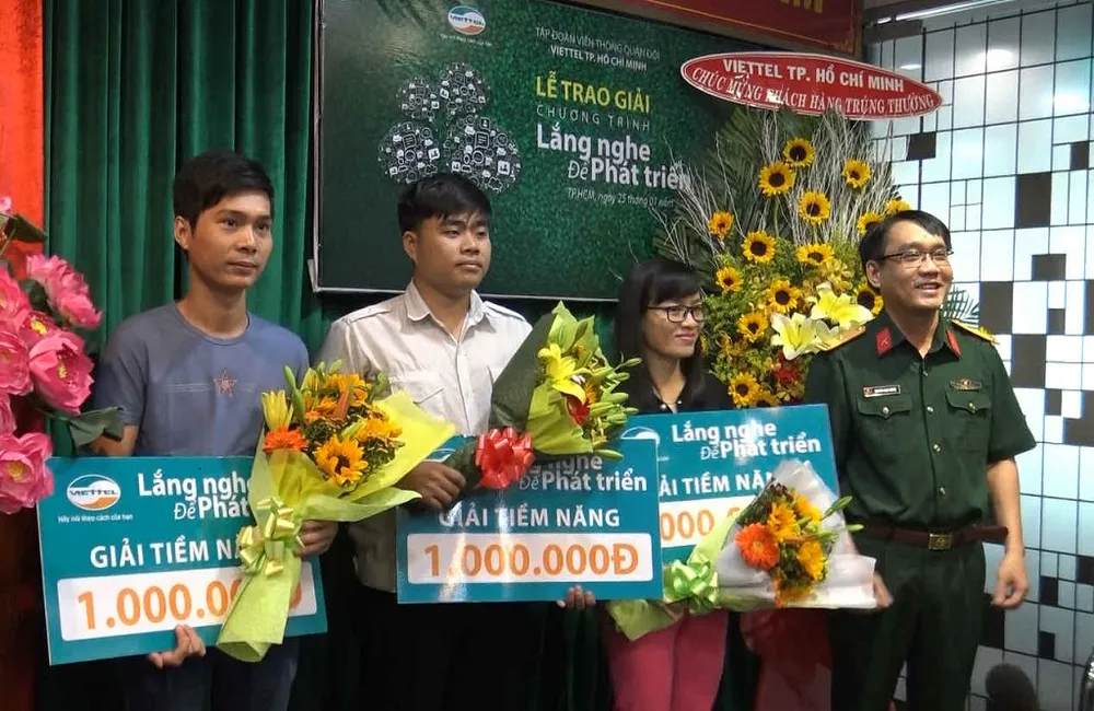 Viettel TP.HCM vừa trao giải cho khách hàng có ý kiến hay nhất về sản phẩm dịch vụ của Viettel trong khuôn khổ đợt 2 của chương trình “Lắng nghe để phát triển”. Đây là hoạt động thường niên của Viettel nhằm tôn vinh và tri ân những khách hàng tâm huyết đã luôn đóng góp ý kiến cho Viettel.