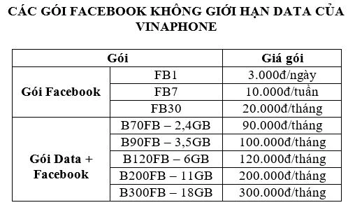 Ngoài ra, để dùng data tốc độ cao và lướt “phây” không giới hạn khách hàng có thể đăng ký gói Facebook kèm data gồm: B70FB (2,4GB) chỉ với 90.000đ/th; Gói B90FB (3,5GB): 100.000đ/th; B120FB (6GB): 120.000đ/th; B200FB (11GB): 200.000đ/th; B300FB (18GB): 300.000đ/th. Với các gói data khủng này, VinaPhone tặng kèm gói Facebook không giới hạn.