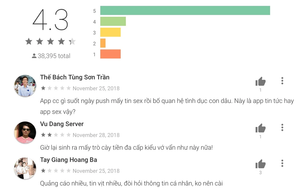 Rõ ràng đây là một chiêu trò câu kéo bạn đọc vô cùng phản cảm. Theo ghi nhận của người viết, ứng dụng này trên Google Play đang nhận phải khá nhiều “gạch đá” từ những người đã cài đặt, cụ thể là hiển thị những tin tức nhạy cảm, tin vịt, quảng cáo linh tinh và đòi hỏi thông tin cá nhân…