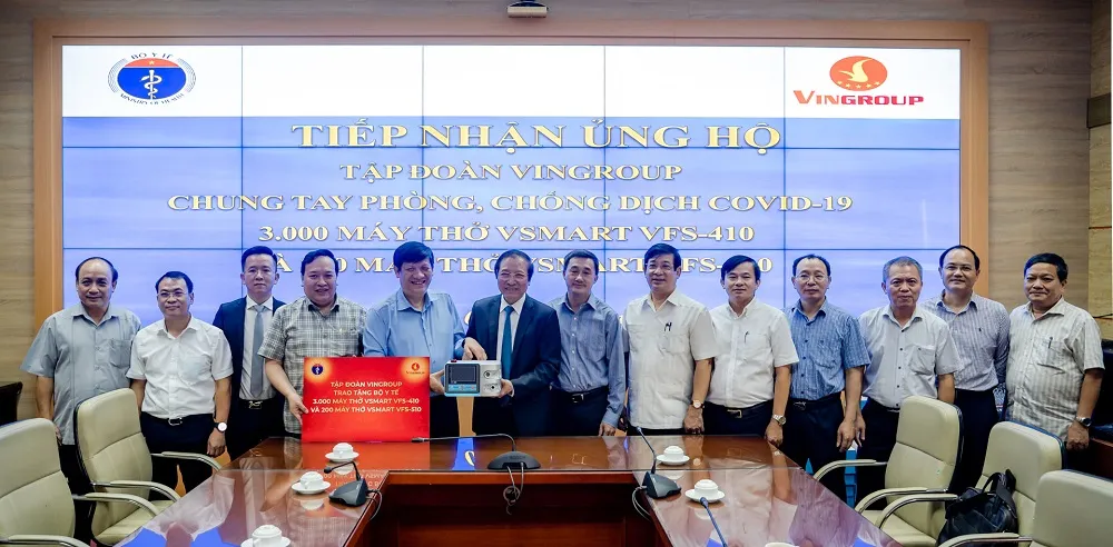 Đại diện Tập đoàn Vingroup tặng Bộ Y tế 3.000 máy thở Vsmart VFS-410 và 200 máy thở Vsmart VFS-510.
