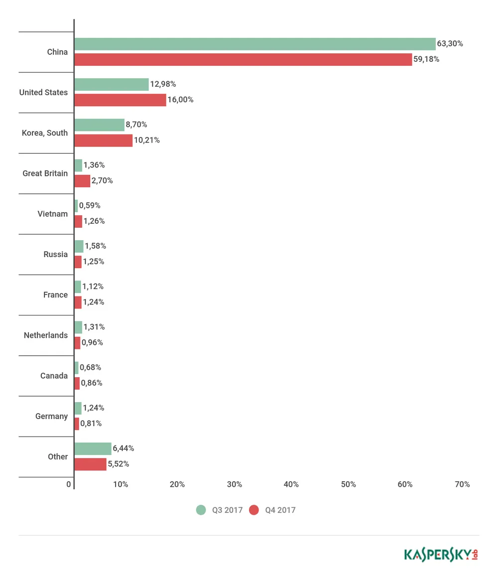 Số lượng quốc gia bị tấn công DDoS có phần giảm xuống trong quý 4-2018 (từ 98 xuống còn 82 quốc gia), tuy nhiên Việt Nam bỗng nhiên lại vượt mặt Hồng Kông và lọt vào top 10 quốc gia bị tấn công DDoS nhiều nhất.