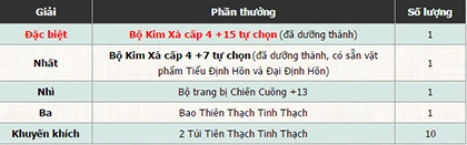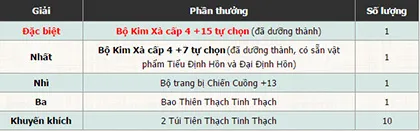 Ngoài việc được nhận mã code tri ân game thủ trị giá 1.000 Xu, game thủ tham dự còn có dịp trải nghiệm những cảm xúc thú vị qua các hoạt động đậm chất VLTK II. Đặc biệt người chơi có cơ hội may mắn trúng thưởng trang bị Kim Xà cấp 4 +15 tự chọn (đã dưỡng thành) hoặc các phần thưởng trang bị Kim Xà cấp 4 +7 tự chọn, trang bị Chiến Cuồng +13, Bao Thiên Thạch Tinh Thạch, Túi Tiên Thạch Tinh Thạch.