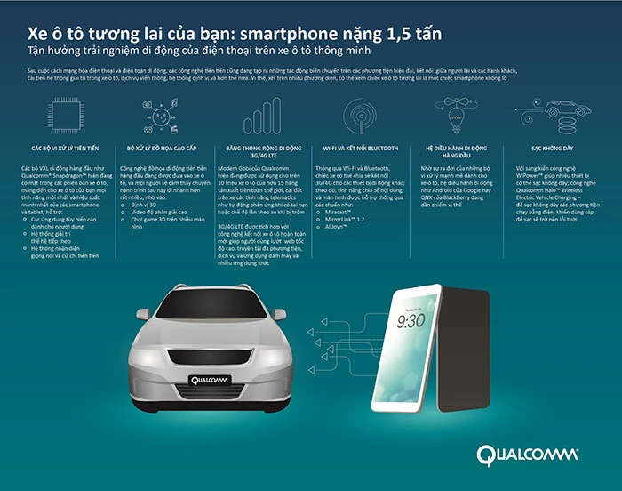 Vì thế, xe ô tô ngày nay có thể vận hành như một chiếc smartphone khổng lồ nhờ vào những công nghệ như: các bộ vi xử lý tiên tiến, bộ xử lý đồ họa cao cấp, băng thông rộng di động 3G/4G LTE, Wi-Fi và kết nối Bluetooth, hệ điều hành di động hàng đầu, sạc không dây, …Chúng ta có thể gọi chúng là smart car - xe ô tô thông minh.