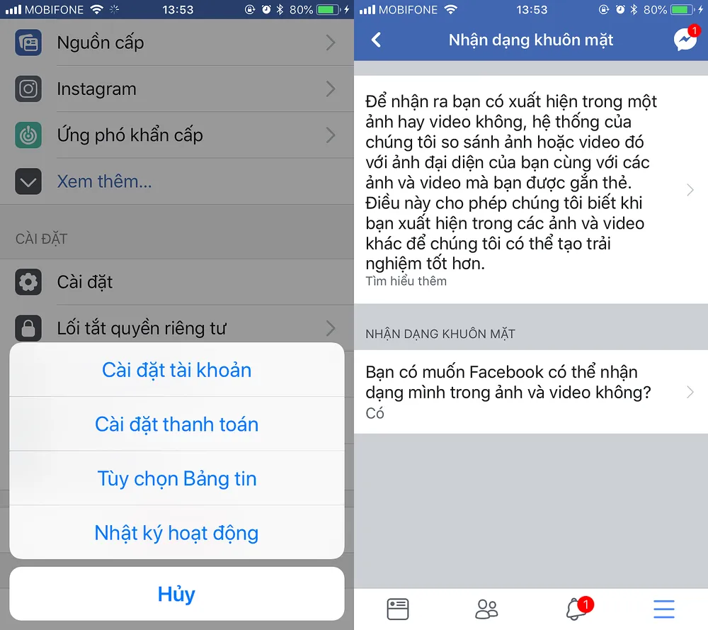 Tương tự, nếu đang sử dụng smartphone, bạn chỉ cần mở ứng dụng Facebook, bấm vào biểu tượng menu ở góc phải bên dưới và chọn Settings (cài đặt) > Account settings (cài đặt tài khoản) > Face Recognition (nhận diện khuôn mặt) > Yes (có). Lưu ý, sau khi bật tính năng nhận diện khuôn mặt, Facebook sẽ quét toàn bộ ảnh và video bạn tải lên để bổ sung vào cơ sở dữ liệu, từ đó hiển thị cảnh báo kịp thời nếu có ai đó sử dụng hình ảnh của bạn để giả mạo thông tin.