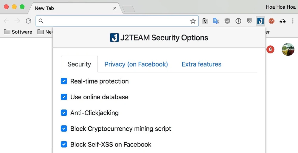 Bên cạnh đó, J2TEAM Security còn giúp ngăn chặn các vấn nạn lừa đảo, mất cắp tài khoản trên Facebook. Để sử dụng, bạn chỉ cần kích hoạt tùy chọn Real-time protection (Bảo vệ theo thời gian thực), Use online database (Sử dụng cơ sở dữ liệu online), Anti-Clickjacking (Chặn Clickjacking), Block Self-XSS on Facebook (Chặn Self-XSS trên Facebook).