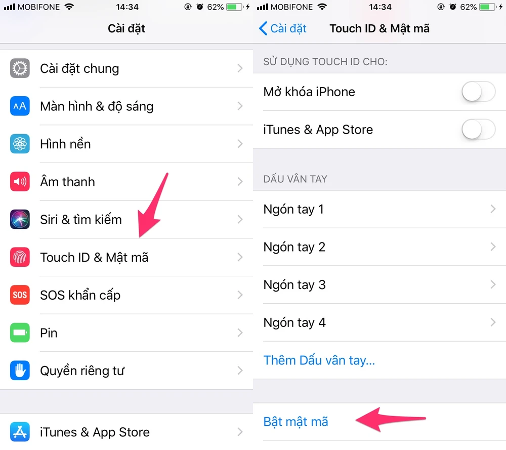Đầu tiên, bạn hãy truy cập vào phần Settings (cài đặt) trên iPhone, iPad, kéo xuống bên dưới và chọn Touch ID & Passcode (Touch ID & mật mã), nhập mật khẩu khóa màn hình khi được yêu cầu. Sau đó, bạn hãy chọn Turn Passcode Off (tắt mật mã).
