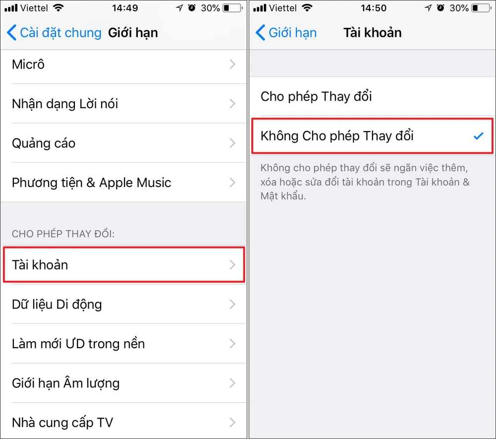 Tiếp theo, bạn kéo xuống bên dưới và chọn Allow Changes (cho phép thay đổi) > Accounts (tài khoản) > Don't Allow Changes (không cho phép thay đổi). Tùy chọn này sẽ ngăn cản việc thêm, xoá hoặc sửa đổi tài khoản trong Accounts & Passwords (tài khoản & mật khẩu). Sau này muốn thay đổi mật khẩu, bạn chỉ cần truy cập vào lại phần bên trên và chọn lại Allow Changes (cho phép thay đổi).