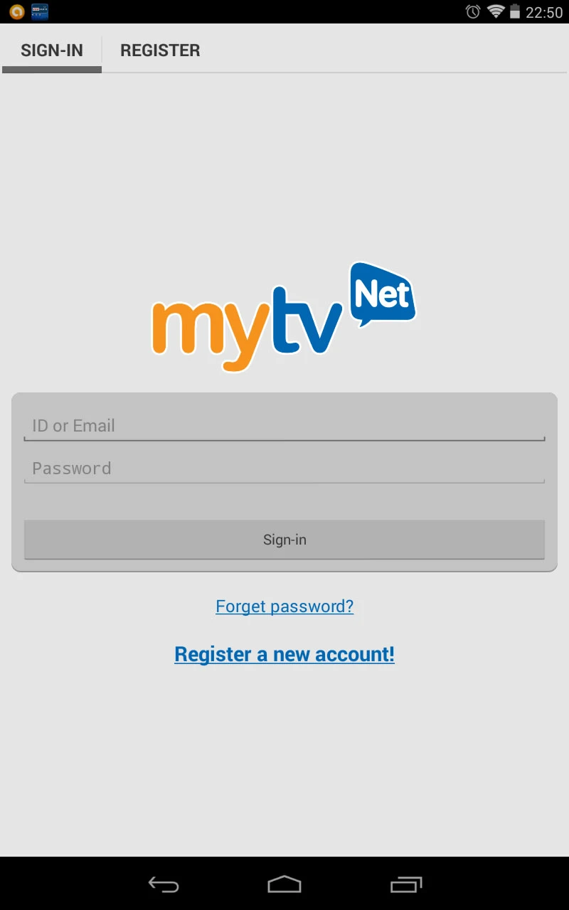 Đầu tiên, bạn cần đăng nhập vào ứng dụng bằng tài khoản MyTV Net, nếu chưa có thì tiến hành tạo mới thông qua liên kết Register a new account hoặc chuyển qua thẻ Register ở bên trên.