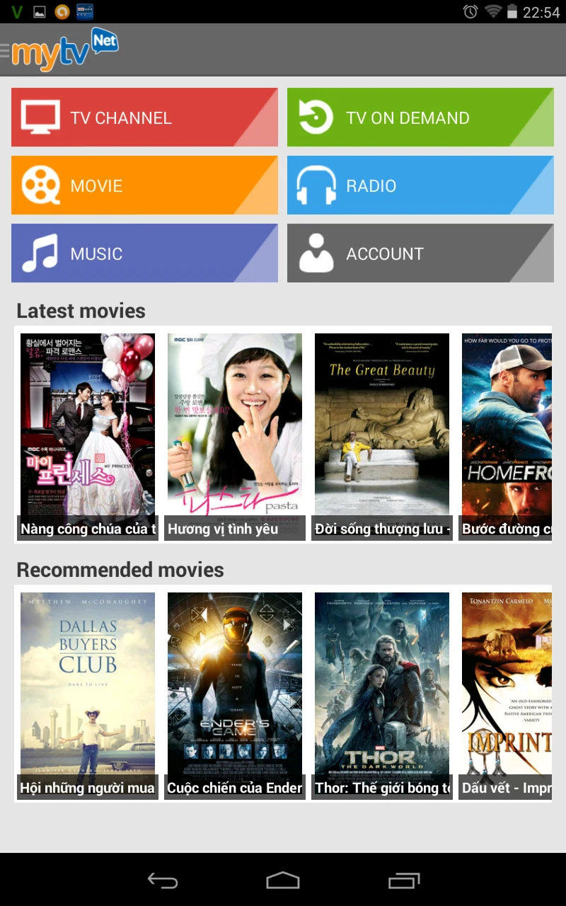 Chương trình có giao diện đơn giản, được thiết kế theo phong cách Modern UI trông rất đẹp mắt. Màn hình chính bao gồm các mục chính như TV Channel, TV On Demand, Movie, Radio, Music, Account và một số bộ phim mới vừa được cập nhật hoặc chọn lọc.