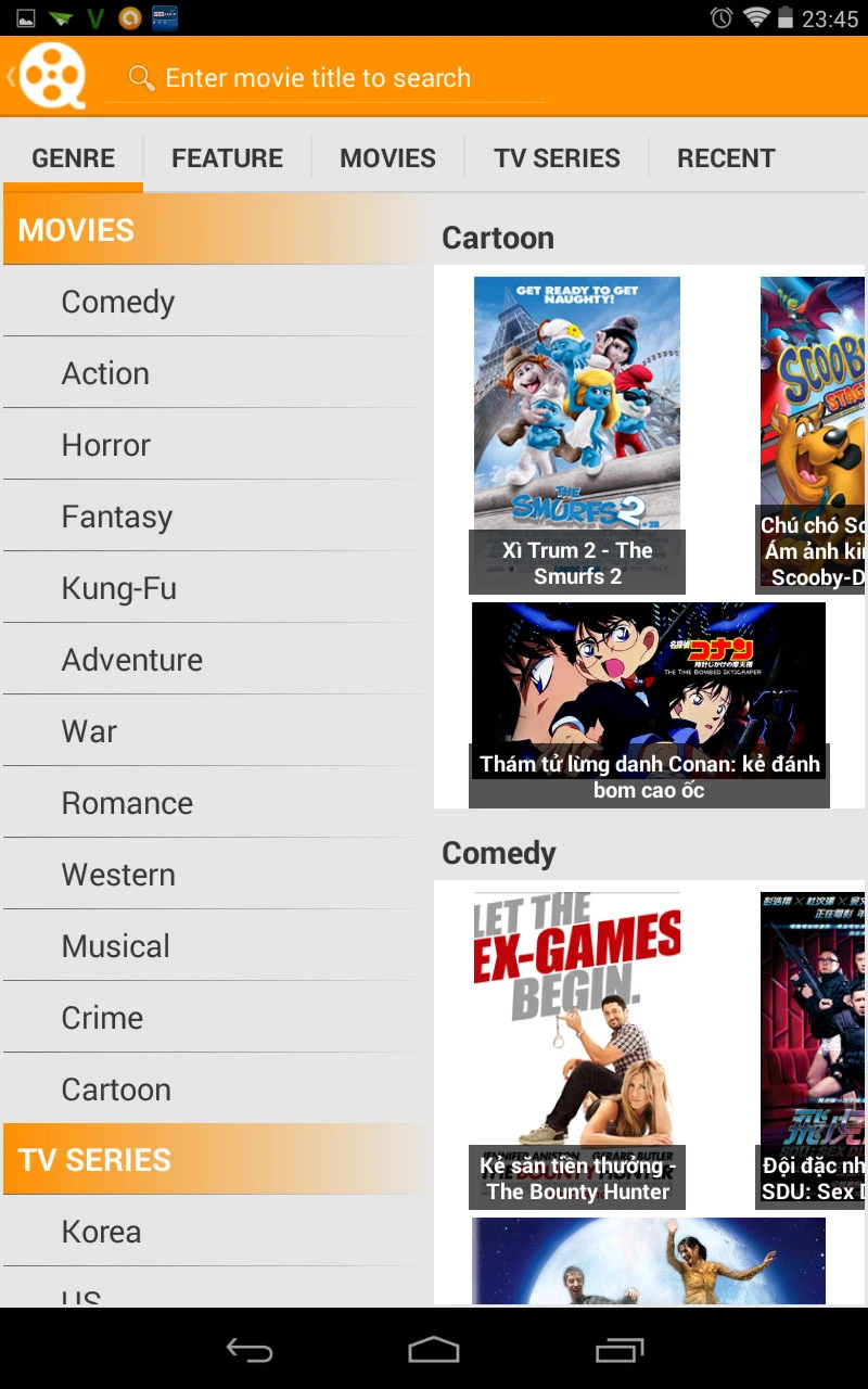 - Movie: Chuyển tiếp sang mục này, bạn sẽ thấy ở đây danh sách phim đều được chia thành từng thể loại khác nhau như Comedy (hài), Action (hành động), Horror (kinh dị)…và những chương trình truyền hình (TV Series). Luôn có khoảng 250 phim trên hệ thống và kho phim này liên tục được cập nhật hàng tháng.