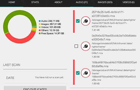 Đầu tiên, bạn cần lựa chọn bộ nhớ máy hoặc thẻ nhớ, sau đó nhấn Find Duplicates để tìm kiếm. Khi hoàn tất, nó sẽ tự động đánh dấu các tập tin bị trùng theo từng mục, người dùng chỉ cần xem lại rồi nhấn vào biểu tượng thùng rác, việc này sẽ giúp tăng tốc smartphone.