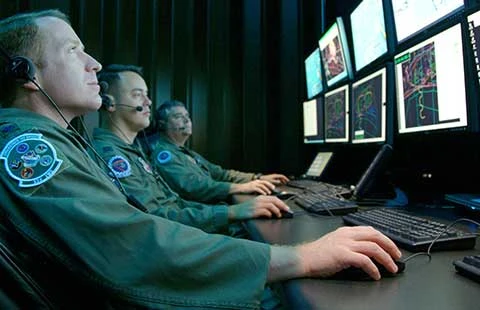 Các chiến binh mạng đang quan sát một cuộc thử nghiệm trận chiến ảo tại Bộ Chỉ huy trung tâm ở căn cứ không quân Eglin (Mỹ). Ảnh: Internet