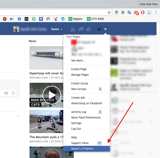 Để khắc phục vấn đề, đầu tiên, bạn hãy đăng nhập vào Facebook bằng trình duyệt, sau đó kích vào biểu tượng mũi tên ở góc trên bên phải và chọn Report a Problem. Trong cửa sổ tiếp theo, bạn chọn vào liên kết Something isn’t Working.