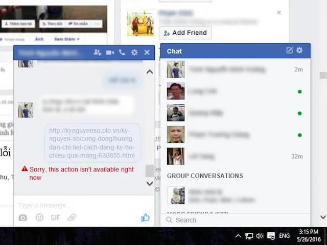 Theo đó, khi gửi một liên kết bất kỳ cho bạn bè thông qua Messenger, đôi lúc bạn sẽ thấy xuất hiện thông báo Sorry, this action isn’t available right now (nếu đang sử dụng máy tính). Thậm chí, một số người còn cho biết sau đó họ không thể đăng nhập Facebook trên Chrome mà chỉ có thể sử dụng trình duyệt Microsoft Edge.