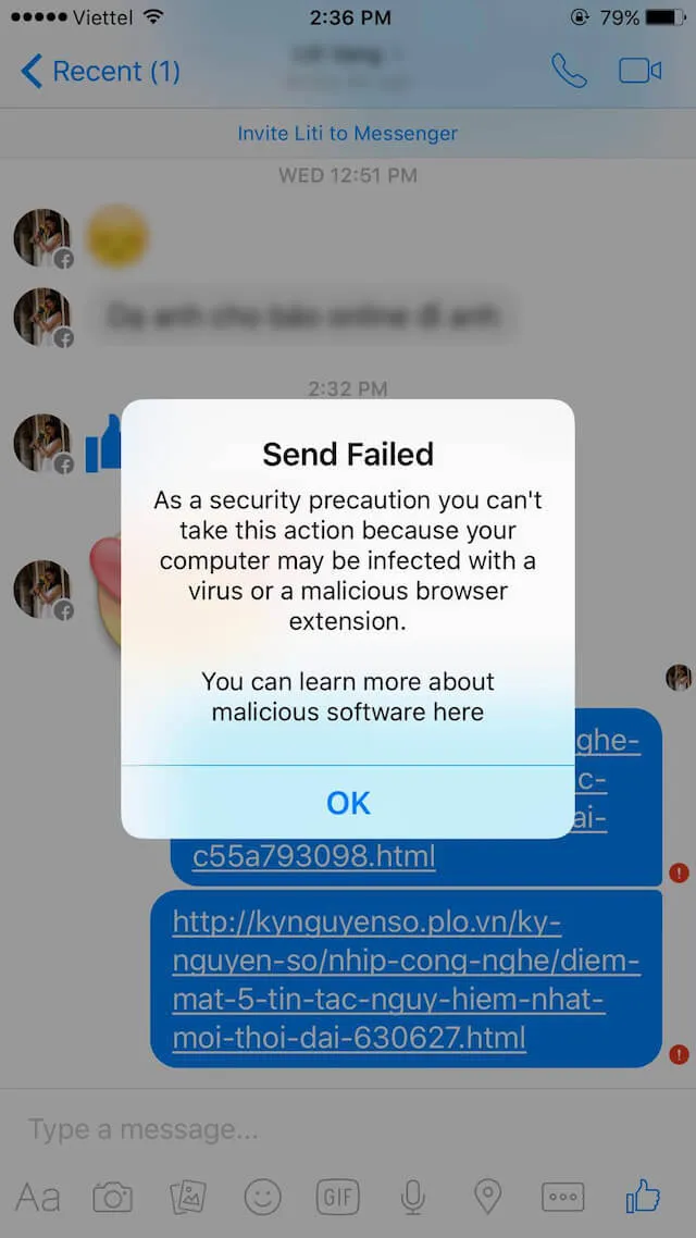 Anh T.B ở Tân Phú cho biết: “Tôi không thể gửi link bài viết cho bạn bè dù liên kết đó chẳng có gì độc hại, trước đây vẫn gửi bình thường. Khi làm thử trên smartphone thì vẫn xảy ra tình trạng tương tự, thậm chí Facebook còn báo thiết bị đang nhiễm malware. Lúc quét malware xong thì cảnh báo vẫn liên tục xuất hiện."