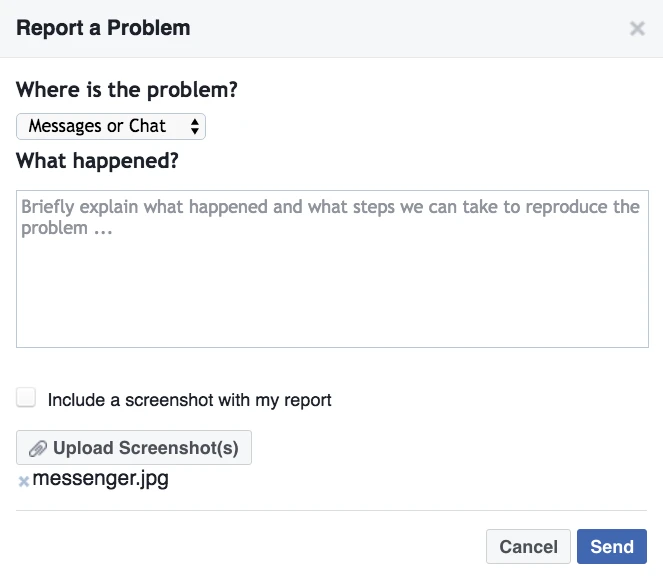 Tại mục Where is the problem, bạn chọn là Messenger or Chat (tùy thuộc vào nơi xảy ra vấn đề), nhập nội dung mô tả sự cố vào mục What happened. Nếu người dùng chụp được hình ảnh báo lỗi thì hãy gửi lên cho Facebook thông qua tùy chọn Upload Screenshot(s), sau đó nhấn Send để gửi đi.
