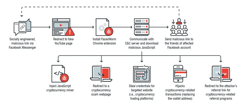 Mã độc mới được gọi là FacexWorm, hoạt động dưới dạng một tiện ích trên trình duyệt Google Chrome. Phiên bản mới của FacexWorm vừa được tích hợp thêm một số tính năng nhằm ăn cắp thông tin tài khoản từ các trang web như Google, các trang giao dịch tiền ảo, chuyển hướng nạn nhân đến các trang web độc hại, lợi dụng phần cứng thiết bị để đào tiền ảo…