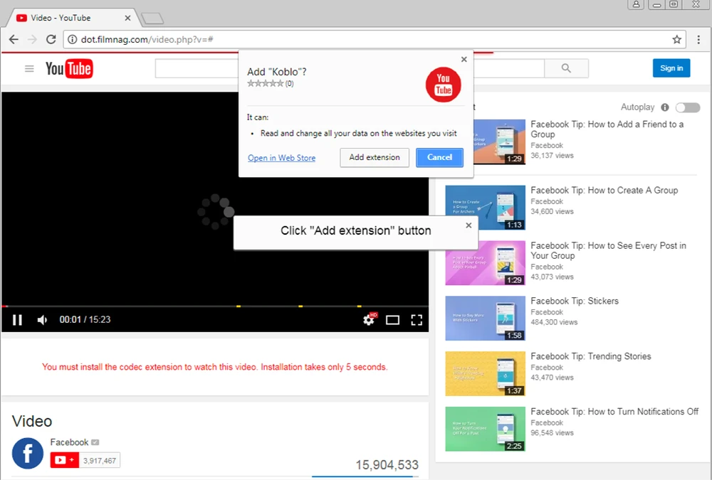 Theo đó, tội phạm mạng sẽ lợi dụng các tài khoản Facebook bị hack, sử dụng chúng để gửi liên kết độc hại đến người khác thông qua Messenger. Khi kích vào bạn sẽ được chuyển hướng đến các trang web phát video trực tuyến giả mạo có giao diện giống hệt YouTube, Vimeo... và yêu cầu cài đặt thêm tiện ích mở rộng để xem video. Lưu ý, tiện ích FacexWorm chỉ nhắm vào người dùng Google Chrome, do đó, nếu bạn mở liên kết bằng trình duyệt khác, phần mềm độc hại sẽ chuyển hướng đến một trang quảng cáo thông thường.