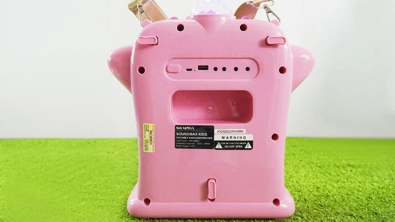 Ở mặt sau loa có các nút chức năng để tùy chỉnh độ lớn âm thanh, nút tạo hiệu ứng tiếng vang cho micro. Điểm đáng chú ý của SoundMax Kids chính là khả năng hỗ trợ ghi âm.