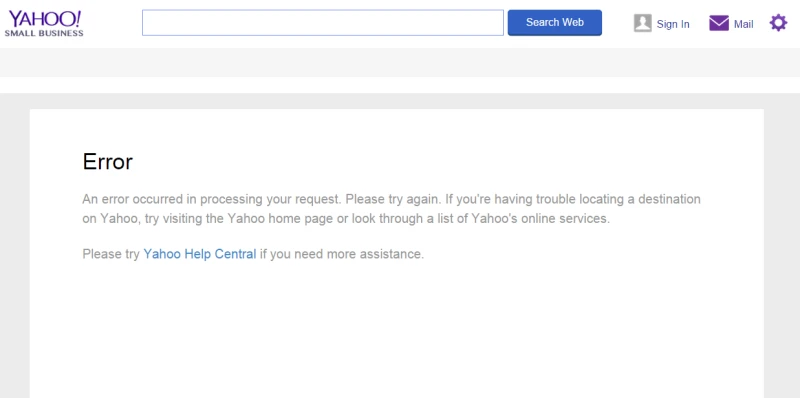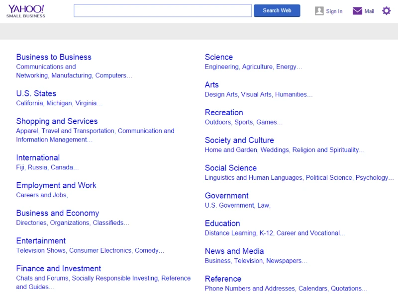 Nếu bạn cố gắng để đăng nhập vào Directory qua địa chỉ http://dir.yahoo.com thì bạn sẽ được chuyển hướng đến một địa chỉ mới của https://business.yahoo.com với một trang chủ của "Yahoo doanh nghiệp nhỏ". Trang mới này vẫn có các thông tin cũ của Yahoo Directory, liệt kê danh mục chẳng hạn như ngôn ngữ học. Tuy nhiên, nếu bạn cố gắng xem các danh sách trong bất kỳ thể loại nào, bạn sẽ nhận được một trang báo lỗi như thế này.