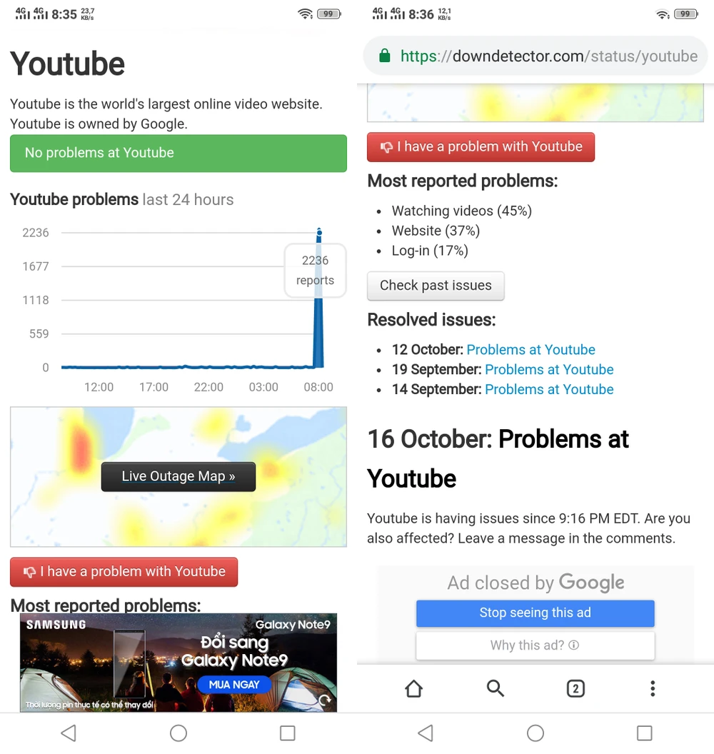 Khi thử kiểm tra tình trạng của YouTube và Facebook bằng dịch vụ https://downdetector.com/, kết quả cho thấy có hơn 2.000 người báo cáo sự cố liên quan đến YouTube, trong đó có 45% không thể xem video, 37% không thể truy cập và 17% gặp vấn đề liên quan đến việc đăng nhập. Đến thời điểm hiện tại, người dùng vẫn không thể truy cập YouTube.