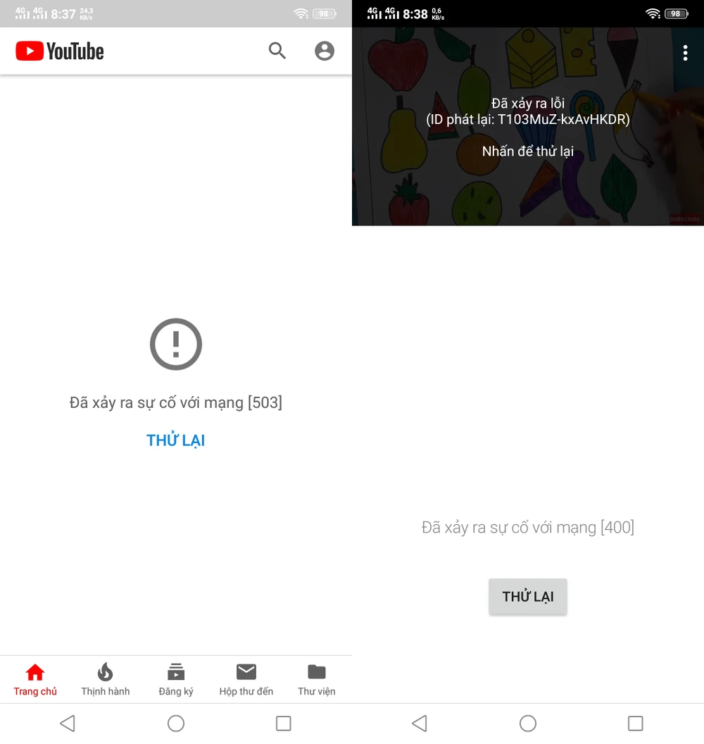 Cụ thể, khi truy cập vào YouTube bằng trình duyệt và cả ứng dụng trên điện thoại, màn hình chỉ hiển thị thông báo Đã xảy ra sự cố với mạng [503] dù kết nối WiFi và 3/4G hoàn toàn bình thường. Mặc dù vậy, người dùng vẫn có thể tìm kiếm video nhưng khi nhấn xem lại xuất hiện thêm lỗi khác.