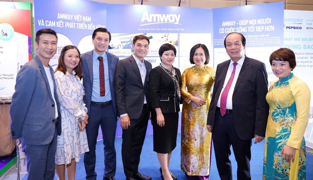 Bộ trưởng, Chủ nhiệm Văn phòng Chính phủ Mai Tiến Dũng chụp ảnh lưu niệm cùng đại diện Amway Việt Nam tại khu trưng bày trách nhiệm xã hội của Amway Việt Nam