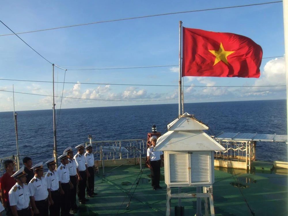 Lễ chào cờ trên Nhà giàn DK1 của Việt Nam. Ảnh: NGÔ BÌNH