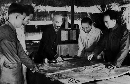 Chủ tịch Hồ Chí Minh, Đại tướng Võ Nguyên Giáp cùng các đồng chí trong Bộ Tư lệnh chiến dịch bàn bạc kế hoạch tác chiến. Ảnh: Tư liệu TTXVN