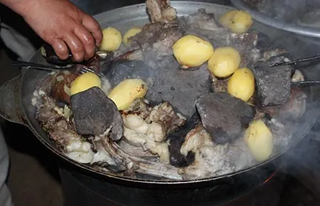 Rau không có nhưng gia súc lại nhiều nên thịt ở Mông Cổ rất rẻ. Người ta ăn thịt, uống sữa tươi thay ăn cơm, uống nước. Chẳng ai mua vài lạng, vài kilogam thịt mà mua cả tảng to, cả cái đùi dê, ngựa. Một con dê gần 30 kg có giá chưa đến 2 triệu đồng Việt Nam. Gia đình du mục nơi tôi ở chế biến cho chúng tôi món dê hầm đá nướng - là những cục đá nhặt ngoài đồng nướng cho chín đỏ rồi bỏ vào nồi thịt, thêm vài củ khoai tây và nêm một chút muối. Thật không có gì vui thú cho bằng trời lạnh tái tê, trong chiếc lều nhỏ thưởng thức những miếng thịt dê ngọt mềm, béo ngậy thơm phưng phức này.
