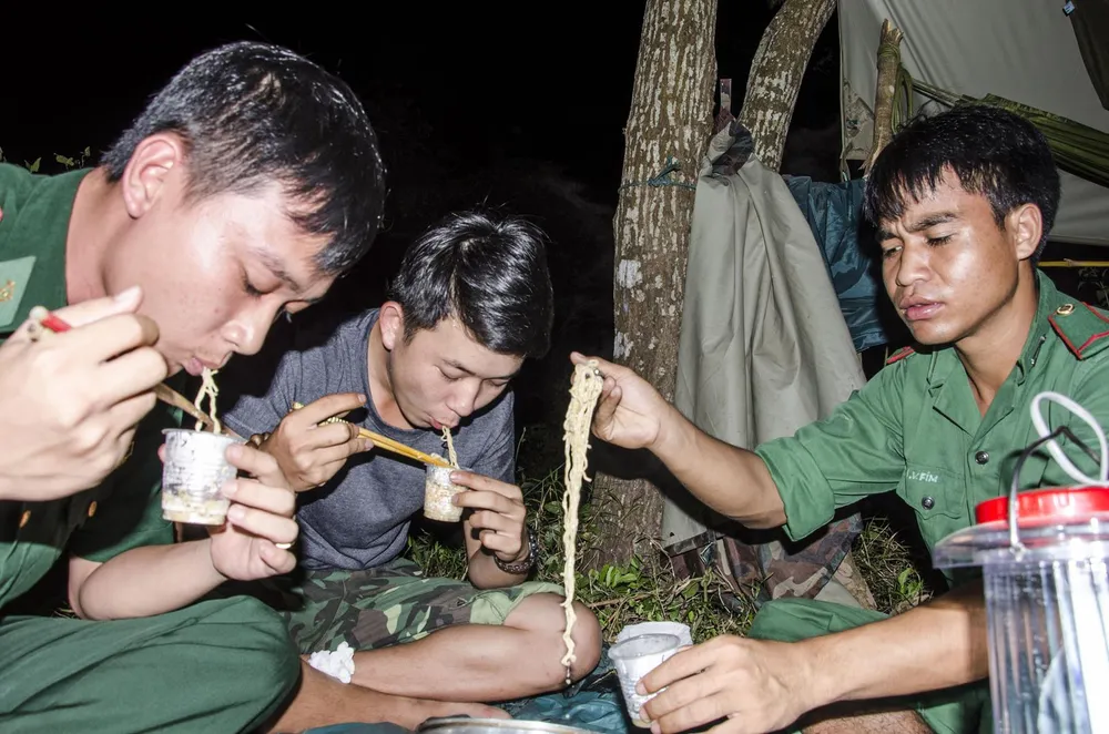 Anh em biên phòng ăn mì tôm lúc nửa đêm tại chốt bên bờ sông Sê Pôn. Ảnh: LÊ VĂN CHƯƠNG