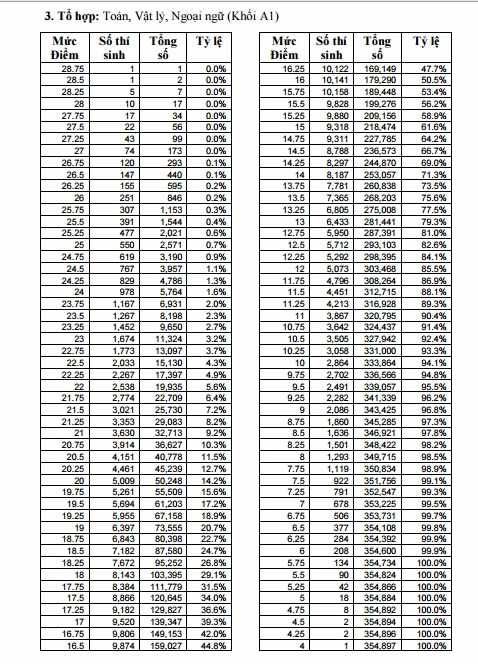 Khối A1, có một thủ khoa của khối này đạt 28,75. Á khoa của khối đạt 28,5 điểm cũng chỉ có một thí sinh. Có 15 thí sinh đạt 28 và 28,5 điểm.