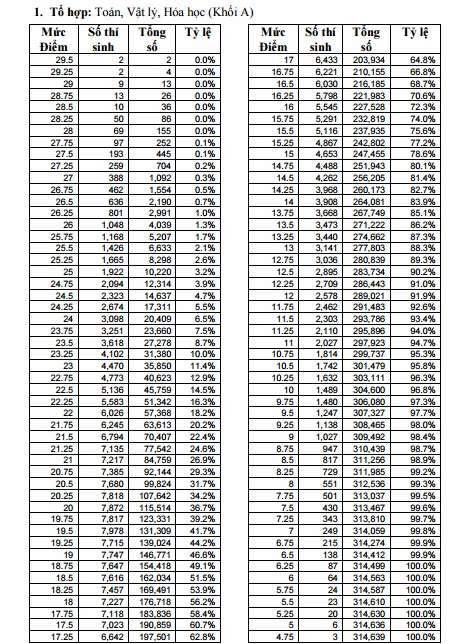 Thủ khoa khối A (môn toán, lý, hóa) là 29,5 điểm, chỉ có hai thí sinh đạt ở mức điểm này. Số thí sinh được 29,25 cũng có hai thí sinh. Ngoài ra, có 9 thí sinh đạt ở mức điểm 29.