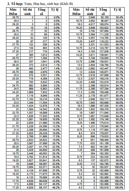 Theo bảng thống kê, ở tất cả các khối thi không có thí sinh nào đạt điểm tuyệt đối 30/30. Có hai thí sinh thủ khoa cả nước được 29,75 ở tổ hợp môn thi khối B.