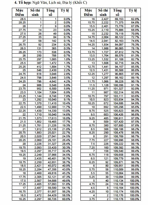 Thủ khoa của khối C, chỉ có một thí sinh đạt 28,5 điểm. Á khoa là một thí sinh đạt 28,25 điểm. Có 7 thí sinh đạt mức 28 điểm.