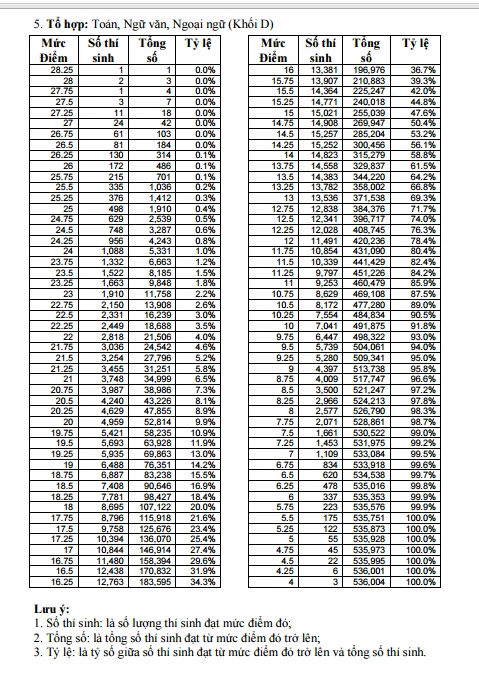 Khối D, có một thí sinh thủ khoa đạt 28,25 điểm, hai thí sinh á khoa đạt 28 điểm.