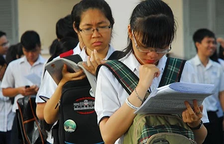 Thí sinh ôn bài trước khi vào phòng thi THPT năm 2014 tại TP.HCM. Ảnh: HTD