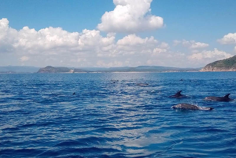 Đàn cá heo xuất hiện khá gần bờ. Ảnh: ANH VƯƠNG