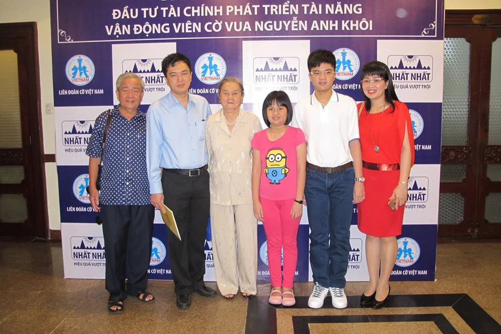 Kỳ thủ Anh Khôi (thứ hai bên phải) cùng gia đình trong ngày nhận tài trợ tiền tỉ.