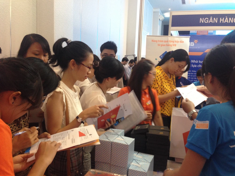 Nhiều lao động trẻ đang tìm kiếm thông tin việc làm tại một buổi tư vấn, giới thiệu cơ hội nghề nghiệp của các nhà tuyển dụng Ảnh: P.ĐIỀN